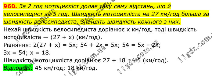 За 2 год мотоцикліст долає таку саму відстань, що й велосипедист за 5 год. Швидкість мотоцикліста на 27 км/год більша за швидкість велосипедиста. Знайдіть швидкість кожного з них. Нехай швидкість велосипедиста дорівнює х км/год, тоді швидкість мотоцикліста — (27 + х) (км/год). Рівняння: 2(27 + х) = 5х; 54 + 2х = 5х; 54 = 5х – 2х; Зх = 54; х = 18. Швидкість мотоцикліста дорівнює 27 + 18 = 45 (км/год). Відповідь: 45 км/год; 18 км/год.