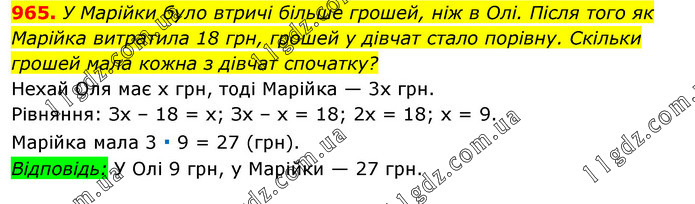 У Марійки було втричі більше грошей, ніж в Олі. Після того як Марійка витратила 18 грн, грошей у дівчат стало порівну. Скільки грошей мала кожна з дівчат спочатку? Нехай Оля має х грн, тоді Марійка — 3х грн. Рівняння: Зх – 18 = х; Зх – х = 18; 2х = 18; х = 9. Марійка мала 3 ∙ 9 = 27 (грн). Відповідь: У Олі 9 грн, у Марійки — 27 грн.