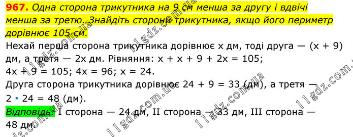 Одна сторона трикутника на 9 см менша за другу і вдвічі менша за третю. Знайдіть сторони трикутника, якщо його периметр дорівнює 105 см. Нехай перша сторона трикутника дорівнює х дм, тоді друга — (х + 9) дм, а третя — 2х дм. Рівняння: х + х + 9 + 2х = 105; 4х + 9 = 105; 4х = 96; х = 24. Друга сторона трикутника дорівнює 24 + 9 = 33 (дм), а третя — 2 ∙ 24 = 48 (дм). Відповідь: І сторона — 24 дм, II сторона — 33 дм, III сторона — 48 дм.