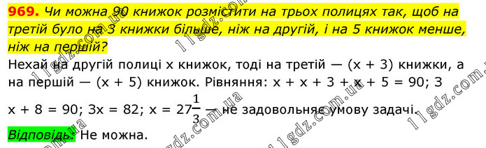Чи можна 90 книжок розмістити на трьох полицях так, щоб на третій було на 3 книжки більше, ніж на другій, і на 5 книжок менше, ніж на першій? Нехай на другій полиці х книжок, тоді на третій — (х + 3) книжки, а на першій — (х + 5) книжок. Рівняння: х + х + 3 + х + 5 = 90; З х + 8 = 90; Зх = 82; х = 271/3 — не задовольняє умову задачі. Відповідь: He можна.