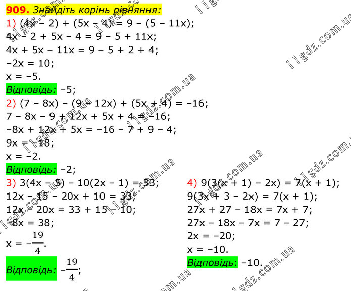 Знайдіть корінь рівняння: 1) (4х – 2) + (5х – 4) = 9 – (5 – 11х); 4х – 2 + 5х – 4 = 9 – 5 + 11х; 4х + 5х – 11x = 9 – 5 + 2 + 4; –2х = 10; х = –5. Відповідь: –5; 2) (7 – 8х) – (9 – 12х) + (5х + 4) = –16; 7 – 8х – 9 + 12х + 5х + 4 = –16; –8х + 12х + 5х = –16 – 7 + 9 – 4; 9х = –18; х = –2. Відповідь: –2; 3) 3(4х – 5) – 10(2х – 1) = 33; 12х – 15 – 20х + 10 = 33; 12х – 20х = 33 + 15 – 10; –8х = 38; x = –19/4. Відповідь: –19/4; 4) 9(3(х + 1) – 2х) = 7(х + 1); 9(3х + 3 – 2х) = 7(х + 1); 27х + 27 – 18х = 7х + 7; 27х – 18x – 7x = 7 – 27; 2х = –20; х = –10. Відповідь: –10.