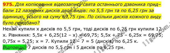Для копіювання відеозапису свята останнього дзвоника прид–бали 12 лазерних дисків двох видів: по 5,5 грн та по 6,25 грн за одиницю, усього на суму 69,75 грн. По скільки дисків кожного виду було придбано? Нехай купили х дисків по 5,5 грн, тоді дисків по 6,25 грн купили 12 – х. Рівняння: 5,5х + 6,25(12 – х) = 69,75; 5,5х + 75 – 6,25х = 69,75; 0,75х = 5,25; х = 7. Купили 12 – 7 = 5 (дисків) по 6,25 к. Відповідь: 7 дисків по 5,5 грн і 5 дисків по 6,25 грн.