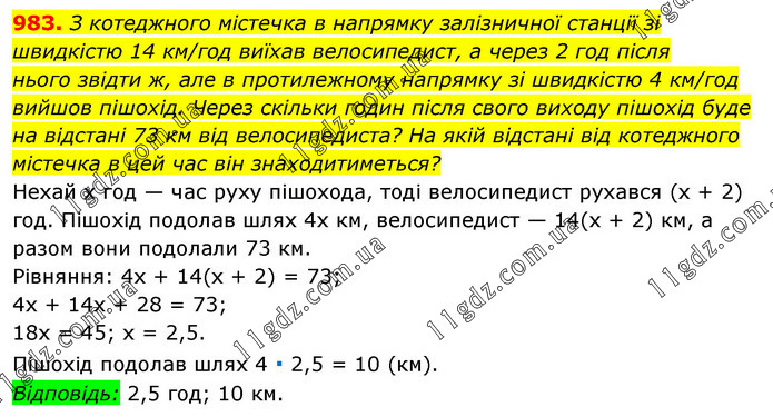 З котеджного містечка в напрямку залізничної станції зі швидкістю 14 км/год виїхав велосипедист, а через 2 год після нього звідти ж, але в протилежному напрямку зі швидкістю 4 км/год вийшов пішохід. Через скільки годин після свого виходу пішохід буде на відстані 73 км від велосипедиста? На якій відстані від котеджного містечка в цей час він знаходитиметься? Нехай х год — час руху пішохода, тоді велосипедист рухався (х + 2) год. Пішохід подолав шлях 4х км, велосипедист — 14(х + 2) км, а разом вони подолали 73 км. Рівняння: 4х + 14(х + 2) = 73; 4х + 14х + 28 = 73; 18х = 45; х = 2,5. Пішохід подолав шлях 4 ∙ 2,5 = 10 (км). Відповідь: 2,5 год; 10 км.