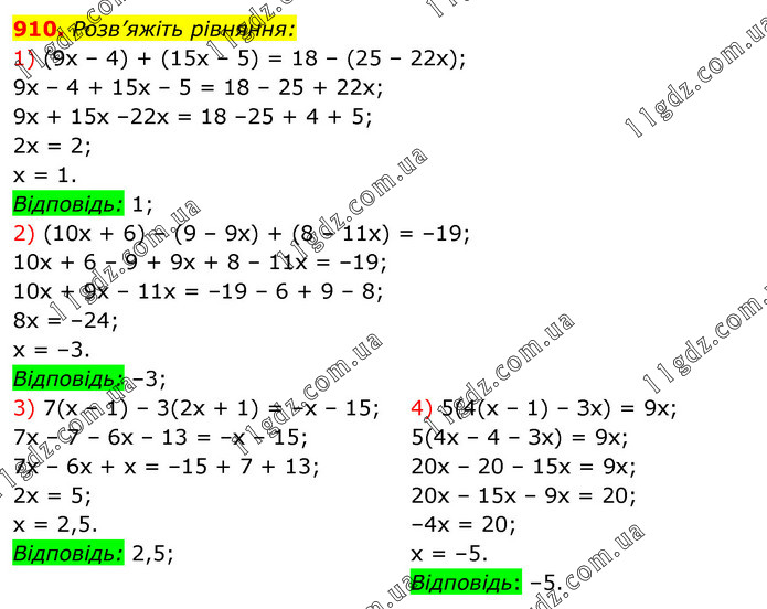 Розв’яжіть рівняння: 1) (9х – 4) + (15х – 5) = 18 – (25 – 22х); 9х – 4 + 15х – 5 = 18 – 25 + 22х; 9х + 15х –22х = 18 –25 + 4 + 5; 2х = 2; х = 1. Відповідь: 1; 2) (10х + 6) – (9 – 9х) + (8 – 11х) = –19; 10x + 6 – 9 + 9х + 8 – 11x = –19; 10x + 9х – 11x = –19 – 6 + 9 – 8; 8х = –24; х = –3. Відповідь: –3; 3) 7(х – 1) – 3(2x + 1) = –х – 15; 7х – 7 – 6х – 13 = –х – 15; 7х – 6х + х = –15 + 7 + 13; 2х = 5; х = 2,5. Відповідь: 2,5; 4) 5(4(х – 1) – Зх) = 9х; 5(4х – 4 – Зх) = 9х; 20х – 20 – 15х = 9х; 20х – 15х – 9х = 20; –4х = 20; х = –5. Відповідь: –5.