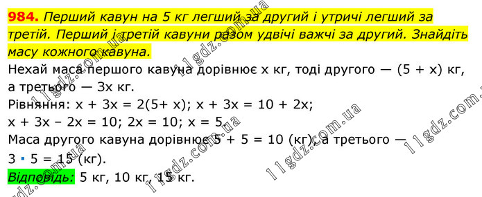 Перший кавун на 5 кг легший за другий і утричі легший за третій. Перший і третій кавуни разом удвічі важчі за другий. Знайдіть масу кожного кавуна. Нехай маса першого кавуна дорівнює х кг, тоді другого — (5 + х) кг, а третього — Зх кг. Рівняння: х + 3х = 2(5+ х); х + 3х = 10 + 2х; х + 3х – 2х = 10; 2х = 10; х = 5. Маса другого кавуна дорівнює 5 + 5 = 10 (кг), а третього — 3 ∙ 5 = 15 (кг). Відповідь: 5 кг, 10 кг, 15 кг.