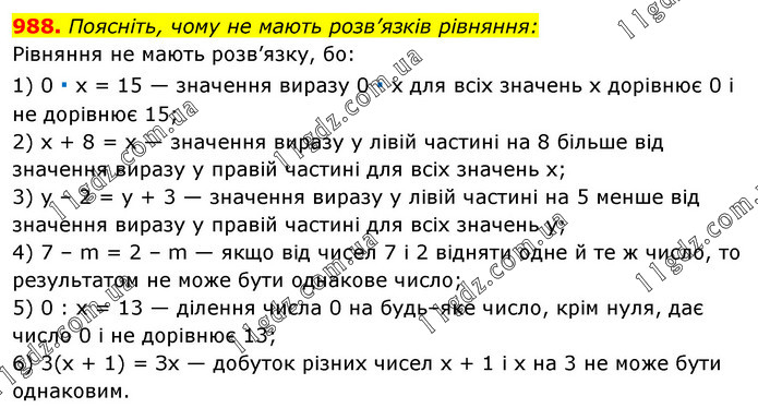 Поясніть, чому не мають розв’язків рівняння: Рівняння не мають розв’язку, бо: 1) 0 ∙ х = 15 — значення виразу 0 ∙ х для всіх значень х дорівнює 0 і не дорівнює 15; 2) х + 8 = х — значення виразу у лівій частині на 8 більше від значення виразу у правій частині для всіх значень х; 3) у – 2 = у + 3 — значення виразу у лівій частині на 5 менше від значення виразу у правій частині для всіх значень y; 4) 7 – m = 2 – m — якщо від чисел 7 і 2 відняти одне й те ж число, то результатом не може бути однакове число; 5) 0 : х = 13 — ділення числа 0 на будь–яке число, крім нуля, дає число 0 і не дорівнює 13; 6) 3(х + 1) = Зх — добуток різних чисел х + 1 і х на 3 не може бути однаковим.