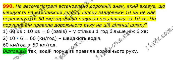 На автомагістралі встановлено дорожній знак, який вказує, що швидкість на найближчій ділянці шляху завдовжки 10 км не має перевищувати 50 км/год. Водій подолав цю ділянку за 10 хв. Чи порушив він правила дорожнього руху на цій ділянці шляху? 1) 60 хв : 10 хв = 6 (разів) – у стільки 1 год більше ніж 6 хв; 2) 10 ∙ 6 = 60 (км/год) – швидкість водія. 60 км/год > 50 км/год. Відповідь: так, водій порушив правила дорожнього руху.
