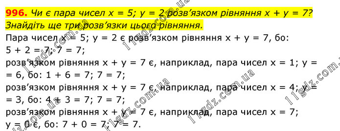 Чи є пара чисел х = 5; у = 2 розв’язком рівняння х + у = 7? Знайдіть ще три розв’язки цього рівняння. Пара чисел х = 5; y = 2 є розв’язком рівняння х + y = 7, бо: 5 + 2 = 7; 7 = 7; розв’язком рівняння х + y = 7 є, наприклад, пара чисел х = 1; y = = 6, бо: 1 + 6 = 7; 7 = 7; розв’язком рівняння х + у = 7 є, наприклад, пара чисел х = 4; у = = З, бо: 4 + 3 = 7; 7 = 7; розв’язком рівняння х + y = 7 є, наприклад, пара чисел х = 7; у = 0 є, бо: 7 + 0 = 7; 7 = 7.