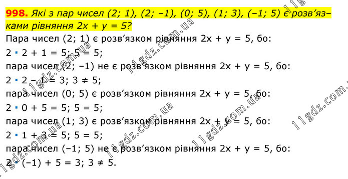 Які з пар чисел (2; 1), (2; –1), (0; 5), (1; 3), (–1; 5) є розв’яз– ками рівняння 2х + у = 5? Пара чисел (2; 1) є розв’язком рівняння 2х + у = 5, бо: 2 ∙ 2 + 1 = 5; 5 = 5; пара чисел (2; –1) не є розв’язком рівняння 2х + у = 5, бо: 2 ∙ 2 – 1 = 3; 3 ≠ 5; пара чисел (0; 5) є розв’язком рівняння 2х + у = 5, бо: 2 ∙ 0 + 5 = 5; 5 = 5; пара чисел (1; 3) є розв’язком рівняння 2х + у = 5, бо: 2 ∙ 1 + 3 = 5; 5 = 5; пара чисел (–1; 5) не є розв’язком рівняння 2х + у = 5, бо: 2 ∙ (–1) + 5 = 3; 3 ≠ 5.