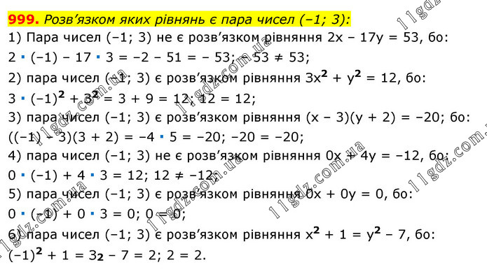 Розв’язком яких рівнянь є пара чисел (–1; 3): 1) Пара чисел (–1; 3) не є розв’язком рівняння 2х – 17y = 53, бо: 2 ∙ (–1) – 17 ∙ 3 = –2 – 51 = – 53; – 53 ≠ 53; 2) пара чисел (–1; 3) є розв’язком рівняння Зх2 + у2 = 12, бо: 3 ∙ (–1)2 + З2 = 3 + 9 = 12; 12 = 12; 3) пара чисел (–1; 3) є розв’язком рівняння (х – 3)(у + 2) = –20; бо: ((–1) – 3)(3 + 2) = –4 ∙ 5 = –20; –20 = –20; 4) пара чисел (–1; 3) не є розв’язком рівняння 0x + 4у = –12, бо: 0 ∙ (–1) + 4 ∙ 3 = 12; 12 ≠ –12; 5) пара чисел (–1; 3) є розв’язком рівняння 0x + 0у = 0, бо: 0 ∙ (–1) + 0 ∙ 3 = 0; 0 = 0; 6) пара чисел (–1; 3) є розв’язком рівняння х2 + 1 = у2 – 7, бо: (–1)2 + 1 = З2 – 7 = 2; 2 = 2.