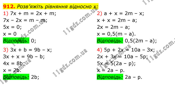 Розв’яжіть рівняння відносно x: 1) 7x + m = 2х + m; 7х – 2х = m – m; 5x = 0; х = 0 Відповідь: 0; 2) а + х = 2m – х; х + х = 2m – а; 2x = 2m – а; х = 0,5(m – а). Відповідь: 0,5(2m – а); 3) 3х + b = 9b – х; Зх + х = 9b – b; 4x = 8b; х = 2b. Відповідь: 2b; 4) 5p + 2х = 10a – Зх; 2х + 3х = 10a – 5p; 5x = 5(2а – р); х = 2а – р. Відповідь: 2а – р.