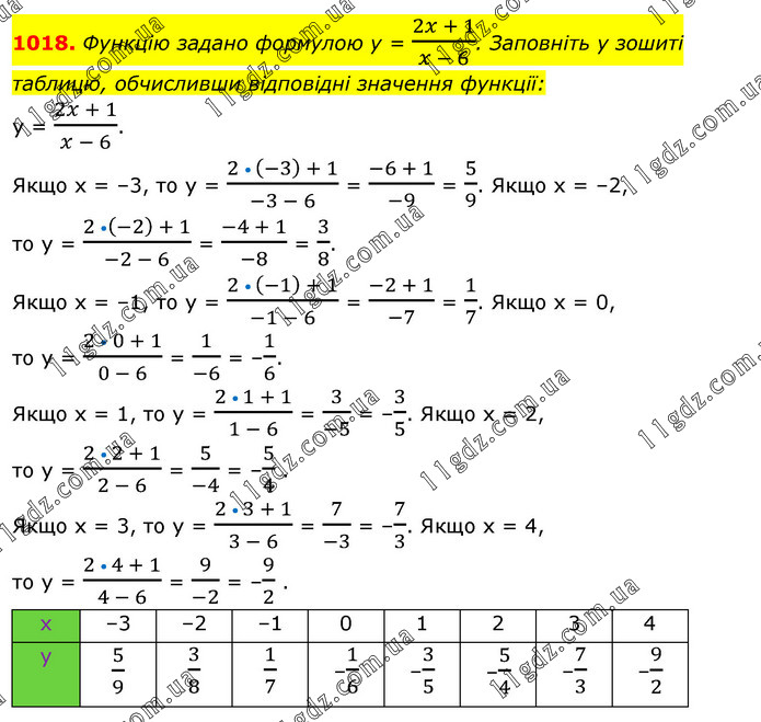 Функцію задано формулою y = (2x + 1)/(x - 6). Заповніть у зошиті таблицю, обчисливши відповідні значення функції: y = (2x + 1)/(x - 6). Якщо х = –3, то у = (2 • (-3) + 1)/(-3 - 6) = (-6 + 1)/(-9) = 5/9. Якщо х = –2, то у = (2 •(-2) + 1)/(-2 - 6) = (-4 + 1)/(-8) = 3/8. Якщо х = –1, то у = (2 • (-1) + 1)/(-1 - 6) = (-2 + 1)/(-7) = 1/7. Якщо х = 0, то у = (2 • 0 + 1)/(0 - 6) = 1/(-6) = –1/6. Якщо х = 1, то у = (2 • 1 + 1)/(1 - 6) = 3/(-5) = –3/5. Якщо х = 2, то у = (2 • 2 + 1)/(2 - 6) = 5/(-4) = –5/4 . Якщо х = 3, то у = (2 • 3 + 1)/(3 - 6) = 7/(-3) = –7/3. Якщо х = 4, то у = (2 • 4 + 1)/(4 - 6) = 9/(-2) = –9/2 .