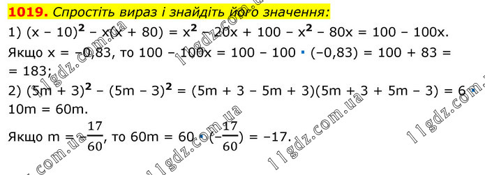 Спростіть вираз і знайдіть його значення: 1) (х – 10)2 – х(х + 80) = х2 – 20х + 100 – х2 – 80x = 100 – 100х. Якщо x = –0,83, то 100 – 100x = 100 – 100 ∙ (–0,83) = 100 + 83 = = 183; 2) (5m + З)2 – (5m – З)2 = (5m + 3 – 5m + 3)(5m + 3 + 5m – 3) = 6 ∙ 10m = 60m. Якщо m = –17/60, то 60m = 60 ∙ (–17/60) = –17.