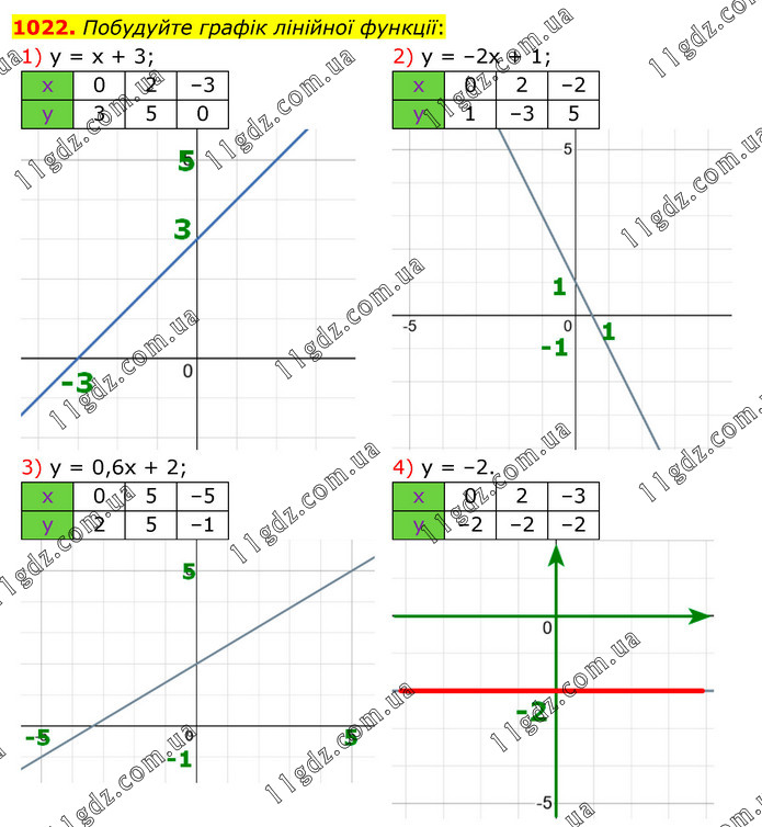 Побудуйте графік лінійної функції: 1) у = х + 3; 2) у = –2х + 1; 3) у = 0,6х + 2; 4) у = –2.