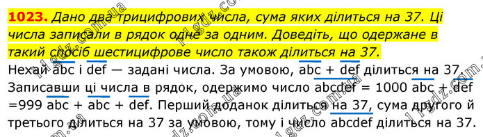 Дано два трицифрових числа, сума яких ділиться на 37. Ці числа записали в рядок одне за одним. Доведіть, що одержане в такий спосіб шестицифрове число також ділиться на 37. Нехай abc і def — задані числа. За умовою, abc + def ділиться на 37. Записавши ці числа в рядок, одержимо число abcdef = 1000 abc + def =999 abc + abc + def. Перший доданок ділиться на 37, сума другого й третього ділиться на 37 за умовою, тому і число abcdef ділиться на 37.