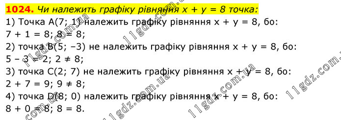 Чи належить графіку рівняння х + у = 8 точка: 1) Точка A(7; 1) належить графіку рівняння х + у = 8, бо: 7 + 1 = 8; 8 = 8; 2) точка B(5; –3) не належить графіку рівняння х + у = 8, бо: 5 – 3 = 2; 2 ≠ 8; 3) точка С(2; 7) не належить графіку рівняння х + у = 8, бо: 2 + 7 = 9; 9 ≠ 8; 4) точка D(8; 0) належить графіку рівняння х + у = 8, бо: 8 + 0 = 8; 8 = 8.