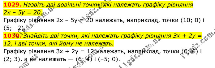 1029. Назвіть дві довільні точки, які належать графіку рівняння 2х – 5у = 20. Графіку рівняння 2х – 5y = 20 належать, наприклад, точки (10; 0) і (5; –2). 1030. Знайдіть дві точки, які належать графіку рівняння Зх + 2у = 12, і дві точки, які йому не належать. Графіку рівняння Зх + 2y = 12 належать, наприклад, точки (0; 6) і (2; 3), а не належать — (6; 4) і (–5; 0).
