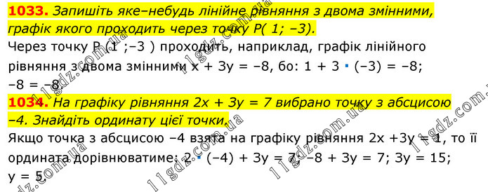 1033. Запишіть яке–небудь лінійне рівняння з двома змінними, графік якого проходить через точку Р( 1; –3). Через точку Р (1 ;–3 ) проходить, наприклад, графік лінійного рівняння з двома змінними х + Зу = –8, бо: 1 + 3 ∙ (–3) = –8; –8 = –8. 1034. На графіку рівняння 2х + Зу = 7 вибрано точку з абсцисою –4. Знайдіть ординату цієї точки. Якщо точка з абсцисою –4 взята на графіку рівняння 2х +3у = 1, то її ордината дорівнюватиме: 2 ∙ (–4) + Зу = 7; –8 + Зу = 7; Зу = 15; у = 5.