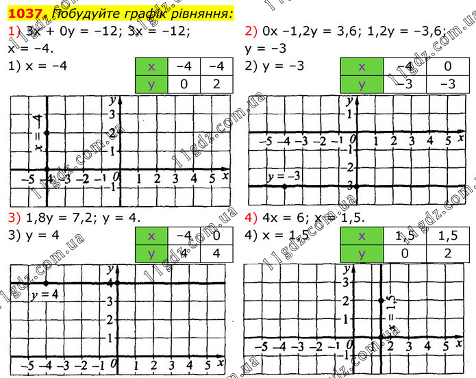 Побудуйте графік рівняння: 1) 3x + 0y = –12; 3x = –12; x = –4. 2) 0x –1,2y = 3,6; 1,2y = –3,6; y = –3