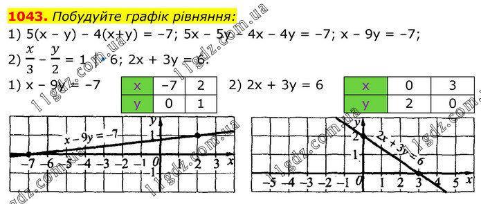 Побудуйте графік рівняння: 1) 5(х – у) – 4(х+у) = –7; 5x – 5у – 4х – 4у = –7; х – 9у = –7;