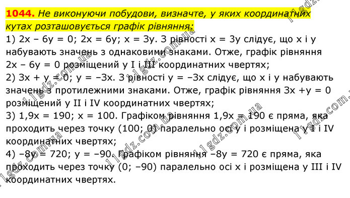 He виконуючи побудови, визначте, у яких координатних кутах розташовується графік рівняння: 1) 2х – 6у = 0; 2x = 6у; х = Зу. З рівності х = 3у слідує, що х і у набувають значень з однаковими знаками. Отже, графік рівняння 2х – 6у = 0 розміщений у І і III координатних чвертях; 2) Зх + у = 0; у = –Зх. З рівності у = –Зх слідує, що х і у набувають значень з протилежними знаками. Отже, графік рівняння Зх +у = 0 розміщений у II і IV координатних чвертях; 3) 1,9х = 190; х = 100. Графіком рівняння 1,9х = 190 є пряма, яка проходить через точку (100; 0) паралельно осі у і розміщена у І і IV координатних чвертях; 4) –8y = 720; у = –90. Графіком рівняння –8у = 720 є пряма, яка проходить через точку (0; –90) паралельно осі х і розміщена у III і IV координатних чвертях.