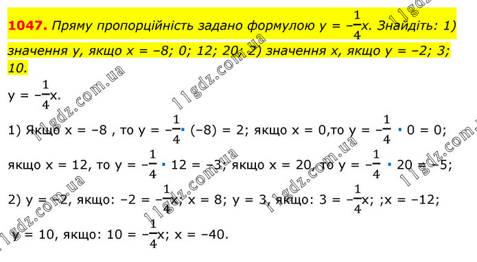 Пряму пропорційність задано формулою у = –1/4х. Знайдіть: 1) значення у, якщо х = –8; 0; 12; 20; 2) значення х, якщо у = –2; 3; 10. у = –1/4х. 1) Якщо х = –8 , то у = –1/4∙ (–8) = 2; якщо х = 0,то у = –1/4 ∙ 0 = 0; якщо x = 12, то у = –1/4 ∙ 12 = –3; якщо x = 20, то y = –1/4 ∙ 20 = –5; 2) y = –2, якщо: –2 = –1/4х; х = 8; у = 3, якщо: 3 = –1/4х; ;х = –12; у = 10, якщо: 10 = –1/4x; х = –40.