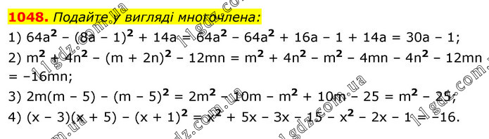 Подайте у вигляді многочлена: 1) 64а2 – (8а – 1)2 + 14а = 64а2 – 64а2 + 16а – 1 + 14а = 30а – 1; 2) m2 + 4n2 – (m + 2n)2 – 12mn = m2 + 4n2 – m2 – 4mn – 4n2 – 12mn = –16mn; 3) 2m(m – 5) – (m – 5)2 = 2m2 – 10m – m2 + 10m – 25 = m2 – 25; 4) (х – 3)(х + 5) – (х + 1)2 = х2 + 5х – Зх – 15 – x2 – 2х – 1 = –16.