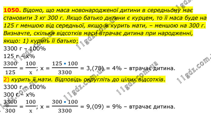 Відомо, що маса новонародженої дитини в середньому має становити 3 кг 300 г. Якщо батько дитини є курцем, то її маса буде на 125 г меншою від середньої, якщо ж курить мати, – меншою на 300 г. Визначте, скільки відсотків маси втрачає дитина при народженні, якщо: 1) курить її батько; 3300 г – 100% 125 г – х% 3300/125 = 100/х; х = (125 • 100)/3300 = 3,(78) = 4% – втрачає дитина. 2) курить її мати. Відповідь округліть до цілих відсотків. 3300 г – 100% 300 г – х% 3300/300 = 100/х; х = (300 • 100)/3300 = 9,(09) = 9% – втрачає дитина.