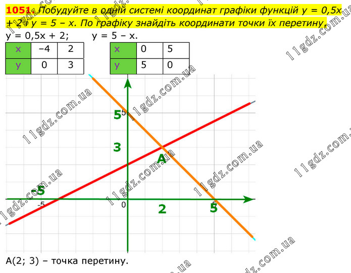 Побудуйте в одній системі координат графіки функцій у = 0,5х + 2 і у = 5 – х. По графіку знайдіть координати точки їх перетину. у = 0,5х + 2; у = 5 – х. А(2; 3) – точка перетину.