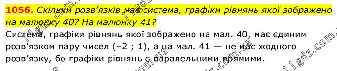 Скільки розв’язків має система, графіки рівнянь якої зображено на малюнку 40? На малюнку 41? Система, графіки рівнянь якої зображено на мал. 40, має єдиним розв’язком пару чисел (–2 ; 1), а на мал. 41 — не має жодного розв’язку, бо графіки рівнянь є паралельними прямими.