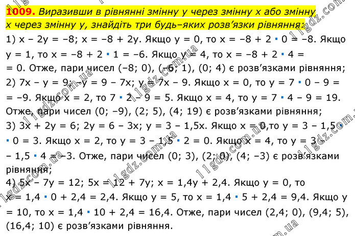 Виразивши в рівнянні змінну у через змінну х або змінну х через змінну у, знайдіть три будь–яких розв’язки рівняння: 1) х – 2y = –8; х = –8 + 2у. Якщо у = 0, то х = –8 + 2 ∙ 0 = –8. Якщо у = 1, то х = –8 + 2 ∙ 1 = –6. Якщо у = 4, то х = –8 + 2 ∙ 4 = = 0. Отже, пари чисел (–8; 0), (–6; 1), (0; 4) є розв’язками рівняння; 2) 7x – у = 9; –у = 9 – 7х; у = 7x – 9. Якщо х = 0, то у = 7 ∙ 0 – 9 = = –9. Якщо х = 2, то 7 ∙ 2 – 9 = 5. Якщо х = 4, то у = 7 ∙ 4 – 9 = 19. Отже, пари чисел (0; –9), (2; 5), (4; 19) є розв’язками рівняння; 3) 3х + 2у = 6; 2y = 6 – 3х; у = 3 – 1,5х. Якщо х = 0,то y = 3 – 1,5 ∙ ∙ 0 = 3. Якщо х = 2, то у = 3 – 1,5 ∙ 2 = 0. Якщо х = 4, то у = 3 – – 1,5 ∙ 4 = –3. Отже, пари чисел (0; 3), (2; 0), (4; –3) є розв’язками рівняння; 4) 5x – 7y = 12; 5х = 12 + 7y; х = 1,4у + 2,4. Якщо у = 0, то х = 1,4 ∙ 0 + 2,4 = 2,4. Якщо у = 5, то х = 1,4 ∙ 5 + 2,4 = 9,4. Якщо у = 10, то х = 1,4 ∙ 10 + 2,4 = 16,4. Отже, пари чисел (2,4; 0), (9,4; 5), (16,4; 10) є розв’язками рівняння.