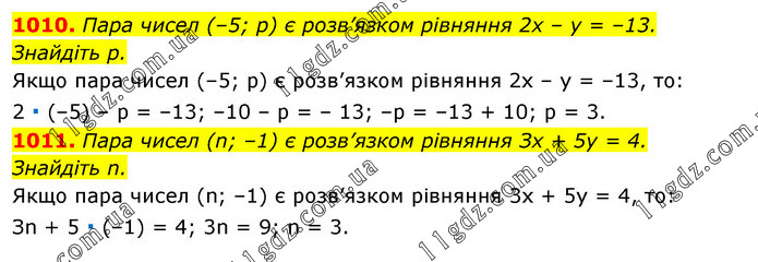 1010. Пара чисел (–5; р) є розв’язком рівняння 2х – у = –13. Знайдіть р. Якщо пара чисел (–5; р) є розв’язком рівняння 2х – у = –13, то: 2 ∙ (–5) – р = –13; –10 – р = – 13; –р = –13 + 10; р = 3. 1011. Пара чисел (n; –1) є розв’язком рівняння Зх + 5у = 4. Знайдіть n. Якщо пара чисел (n; –1) є розв’язком рівняння 3х + 5y = 4, то: Зn + 5 ∙ (–1) = 4; 3n = 9; n = 3.