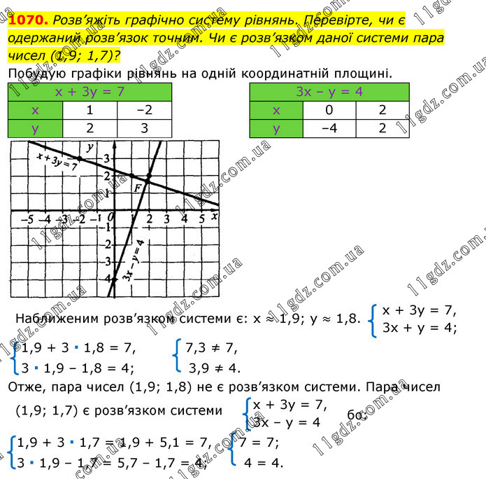 Розв’яжіть графічно систему рівнянь. Перевірте, чи є одержаний розв’язок точним. Чи є розв’язком даної системи пара чисел (1,9; 1,7)?
