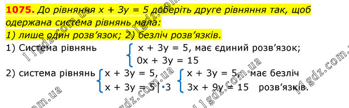 До рівняння х + Зу = 5 доберіть друге рівняння так, щоб одержана система рівнянь мала: 1) лише один розв’язок; 2) безліч розв’язків.