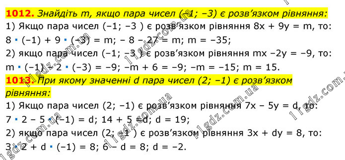 1012. Знайдіть m, якщо пара чисел (–1; –3) є розв’язком рівняння: 1) Якщо пара чисел (–1; –3 ) є розв’язком рівняння 8х + 9у = m, то: 8 ∙ (–1) + 9 ∙ (–3) = m; – 8 – 27 = m; m = –35; 2) якщо пара чисел (–1; –3 ) є розв’язком рівняння mх –2у = –9, то: m ∙ (–1) – 2 ∙ (–3) = –9; –m + 6 = –9; –m = –15; m = 15. 1013. При якому значенні d пара чисел (2; –1) є розв’язком рівняння: 1) Якщо пара чисел (2; –1) є розв’язком рівняння 7x – 5y = d, то: 7 ∙ 2 – 5 ∙ (–1) = d; 14 + 5 =d; d = 19; 2) якщо пара чисел (2; –1 ) є розв’язком рівняння 3х + dy = 8, то: З ∙ 2 + d ∙ (–1) = 8; 6 – d = 8; d = –2.