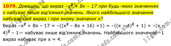 Доведіть, що вираз –x2 + 8х – 17 при будь–яких значеннях х набуває лише від’ємних значень. Якого найбільшого значення набуває цей вираз і при якому значенні х? Вираз –x2 + 8x – 17 = –((х2 – 8х + 16) +1) = –((х – 4)2 + 1) = –(х – 4)2 – 1— набуває лише від’ємних значень. Найбільшого значення –1 вираз набуває при х = 4.