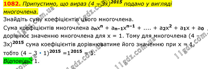 Припустимо, що вираз (4 – Зх)2015 подано у вигляді многочлена. Знайдіть суму коефіцієнтів цього многочлена. Сума коефіцієнтів многочлена аnxn + an–1xn–1 + .... + а2х2 + а1х + а0 дорівнює значенню многочлена для х = 1. Тому для многочлена (4 – Зх)2015 сума коефіцієнтів дорівнюватиме його значенню при х = 1, тобто (4 – 3 ∙ 1)2015 =12015 = 1. Відповідь: 1.