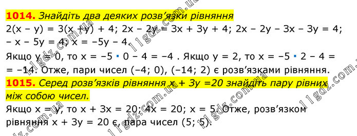 1014. Знайдіть два деяких розв’язки рівняння 2(х – у) = 3(х +у) + 4; 2х – 2у = Зх + Зу + 4; 2х – 2у – Зх – Зу = 4; – х – 5у = 4; х = –5y – 4. Якщо у = 0, то х = –5 ∙ 0 – 4 = –4 . Якщо y = 2, то х = –5 ∙ 2 – 4 = = –14. Отже, пари чисел (–4; 0), (–14; 2) є розв’язками рівняння. 1015. Серед розв’язків рівняння х + Зу =20 знайдіть пару рівних між собою чисел. Якщо х = у, то х + Зх = 20; 4х = 20; х = 5. Отже, розв’язком рівняння х + Зу = 20 є, пара чисел (5; 5).