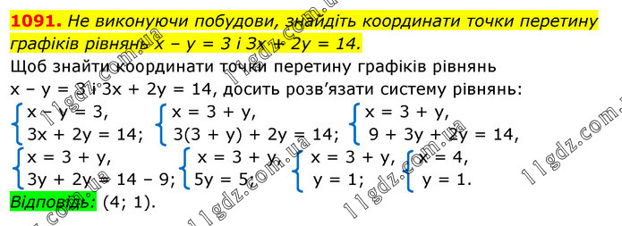 He виконуючи побудови, знайдіть координати точки перетину графіків рівнянь х – у = 3 і Зх + 2у = 14. Щоб знайти координати точки перетину графіків рівнянь x – у = 3 і 3x + 2у = 14, досить розв’язати систему рівнянь:
