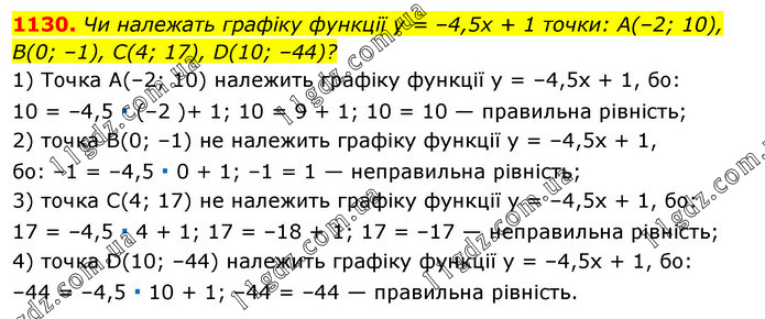 Чи належать графіку функції у = –4,5х + 1 точки: А(–2; 10), B(0; –1), С(4; 17), D(10; –44)? 1) Точка А(–2; 10) належить графіку функції у = –4,5х + 1, бо: 10 = –4,5 ∙ (–2 )+ 1; 10 = 9 + 1; 10 = 10 — правильна рівність; 2) точка B(0; –1) не належить графіку функції у = –4,5х + 1, бо: –1 = –4,5 ∙ 0 + 1; –1 = 1 — неправильна рівність; 3) точка С(4; 17) не належить графіку функції у = –4,5x + 1, бо: 17 = –4,5 ∙ 4 + 1; 17 = –18 + 1; 17 = –17 — неправильна рівність; 4) точка D(10; –44) належить графіку функції у = –4,5х + 1, бо: –44 = –4,5 ∙ 10 + 1; –44 = –44 — правильна рівність.