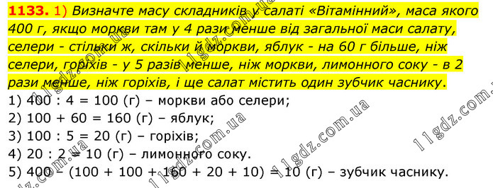 1) Визначте масу складників у салаті «Вітамінний», маса якого 400 г, якщо моркви там у 4 рази менше від загальної маси салату, селери - стільки ж, скільки й моркви, яблук - на 60 г більше, ніж селери, горіхів - у 5 разів менше, ніж моркви, лимонного соку - в 2 рази менше, ніж горіхів, і ще салат містить один зубчик часнику. 1) 400 : 4 = 100 (г) – моркви або селери; 2) 100 + 60 = 160 (г) – яблук; 3) 100 : 5 = 20 (г) – горіхів; 4) 20 : 2 = 10 (г) – лимонного соку. 5) 400 – (100 + 100 + 160 + 20 + 10) = 10 (г) – зубчик часнику.
