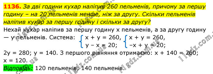 За дві години кухар наліпив 260 пельменів, причому за першу годину – на 20 пельменів менше, ніж за другу. Скільки пельменів наліпив кухар за першу годину і скільки за другу?
