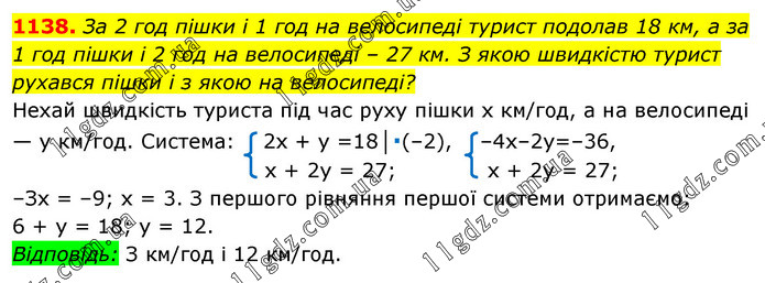 За 2 год пішки і 1 год на велосипеді турист подолав 18 км, а за 1 год пішки і 2 год на велосипеді – 27 км. З якою швидкістю турист рухався пішки і з якою на велосипеді?