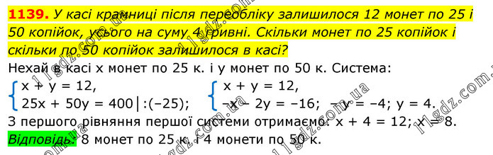 У касі крамниці після переобліку залишилося 12 монет по 25 і 50 копійок, усього на суму 4 гривні. Скільки монет по 25 копійок і скільки по 50 копійок залишилося в касі?