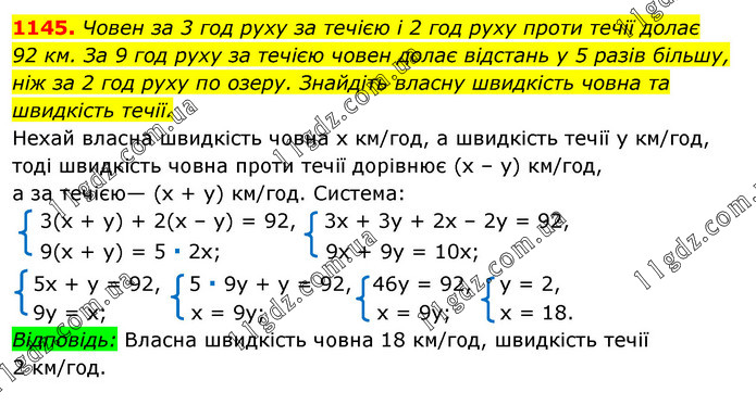 Човен за 3 год руху за течією і 2 год руху проти течії долає 92 км. За 9 год руху за течією човен долає відстань у 5 разів більшу, ніж за 2 год руху по озеру. Знайдіть власну швидкість човна та швидкість течії.
