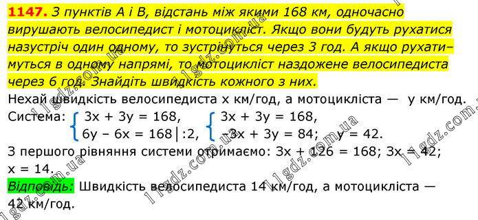 З пунктів A i В, відстань між якими 168 км, одночасно вирушають велосипедист і мотоцикліст. Якщо вони будуть рухатися назустріч один одному, то зустрінуться через 3 год. А якщо рухати– муться в одному напрямі, то мотоцикліст наздожене велосипедиста через 6 год. Знайдіть швидкість кожного з них.