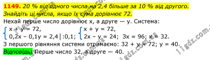 20 % від одного числа на 2,4 більше за 10 % від другого. Знайдіть ці числа, якщо їх сума дорівнює 72.