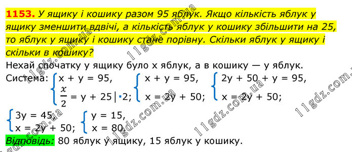 У ящику і кошику разом 95 яблук. Якщо кількість яблук у ящику зменшити вдвічі, а кількість яблук у кошику збільшити на 25, то яблук у ящику і кошику стане порівну. Скільки яблук у ящику і скільки в кошику?