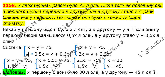 У двох бідонах разом було 75 л олії. Після того як половину олії з першого бідона перелили в другий, олії в другому стало в 4 рази більше, ніж у першому. По скільки олії було в кожному бідоні спочатку?