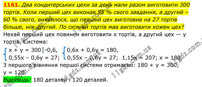 Два кондитерських цехи за день мали разом виготовити 300 тортів. Коли перший цех виконав 55 % свого завдання, а другий – 60 % свого, виявилося, що перший цех виготовив на 27 тортів більше, ніж другий. По скільки тортів мав виготовити кожен цех?